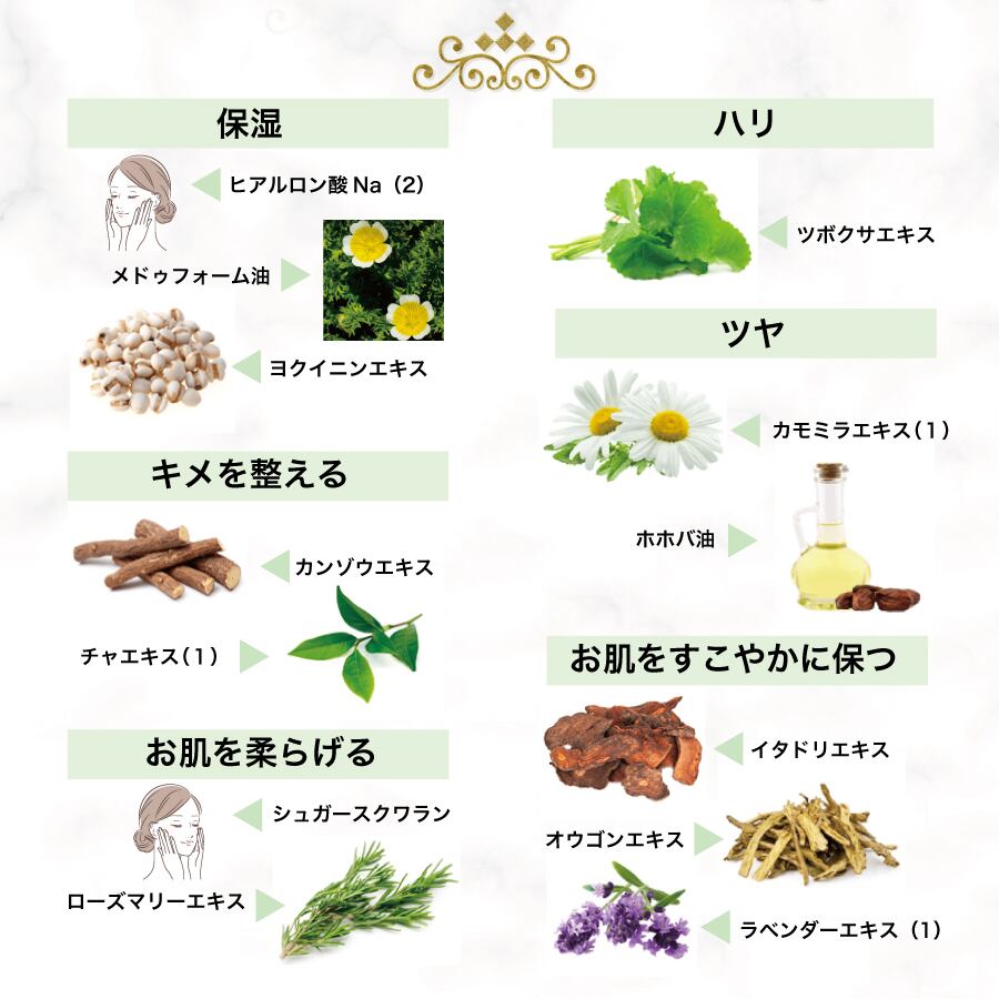 精製水、濃グリセリン、1,3-ブチレングリコール、2-エチルヘキサン酸セチル、シュガースクワラン、1,2-ペンタンジオール、ポリオキシエチレン硬化ヒマシ油、メチルポリシロキサン、セトステアリルグルコシド・セトステアリルアルコール、アラキルグルコシド・アラキルアルコール・ベヘニルアルコール、フェノキシエタノール、キサンタンガム、ジブチルヒドロキシトルエン、ホホバ油、メドウフォーム油、グリセリルグルコシド液、グリコシルトレハロース・水添デンプン分解物混合溶液、ヒアルロン酸ナトリウム(2)、ツボクサエキス、イタドリエキス、オウゴンエキス、カンゾウエキス、チャエキス(1)、ラベンダーエキス(1)、カモミラエキス(1)、ローズマリーエキス、ヨクイニンエキス、二酸化炭素